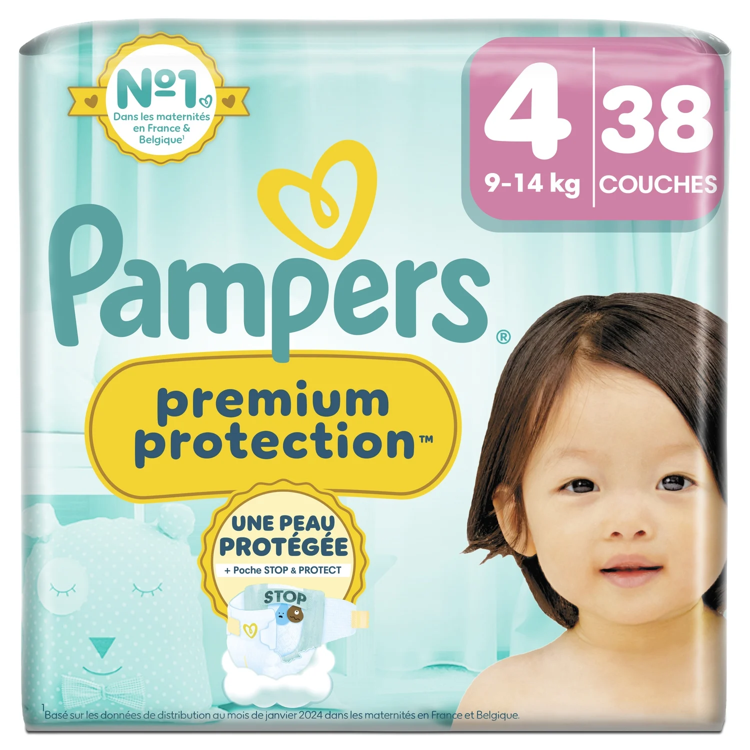 Couches Pampers Premium Protection Taille 4 pour bébés de 9 à 14 kg. Ultra douces, super absorbantes, avec indicateur d’humidité pour un confort optimal jour et nuit.
